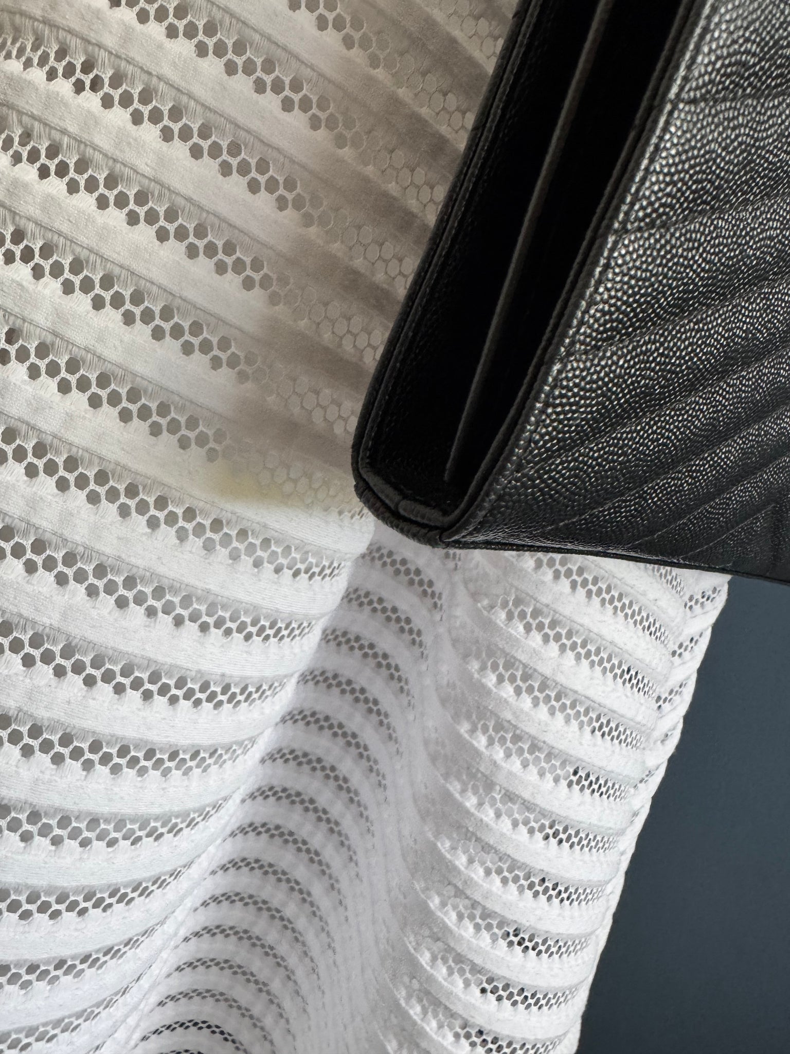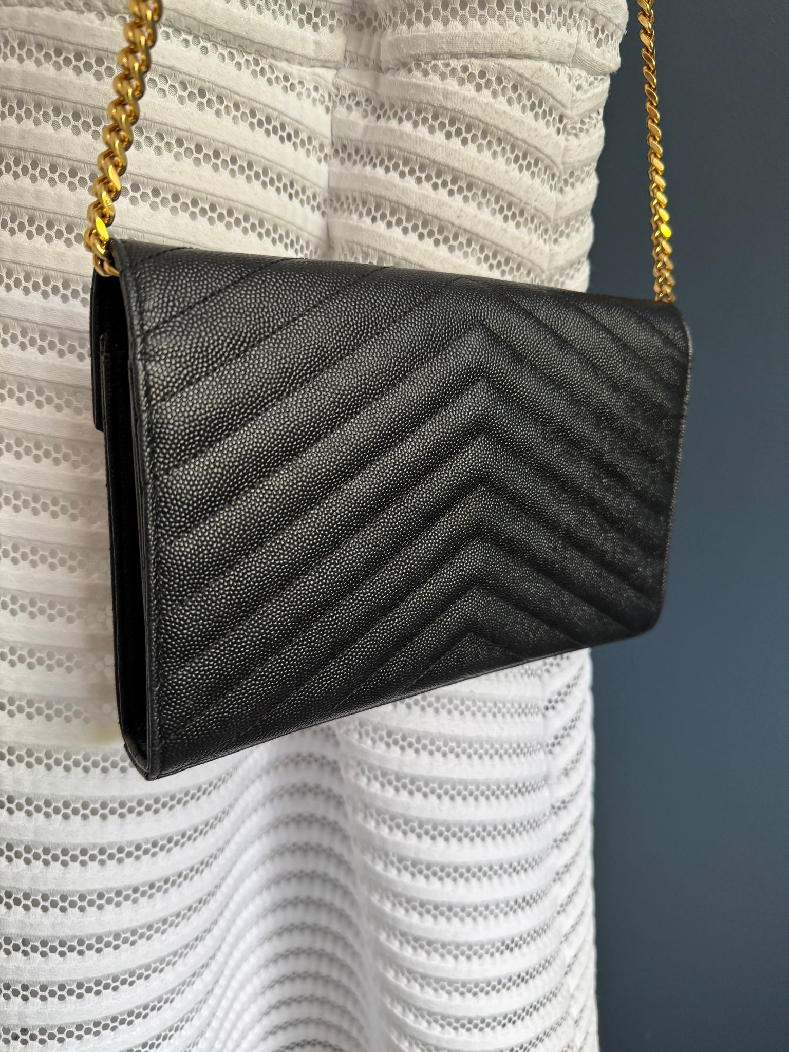 Es ist eine klassische und ikonische Tasche von Saint Laurent im Umschlag-Stil mit einer strukturierten Form und einem markanten goldfarbenen YSL-Logo auf der Vorderseite. Sie ist typischerweise aus genarbtem Kalbsleder gefertigt, oft mit einem Chevron-Muster.