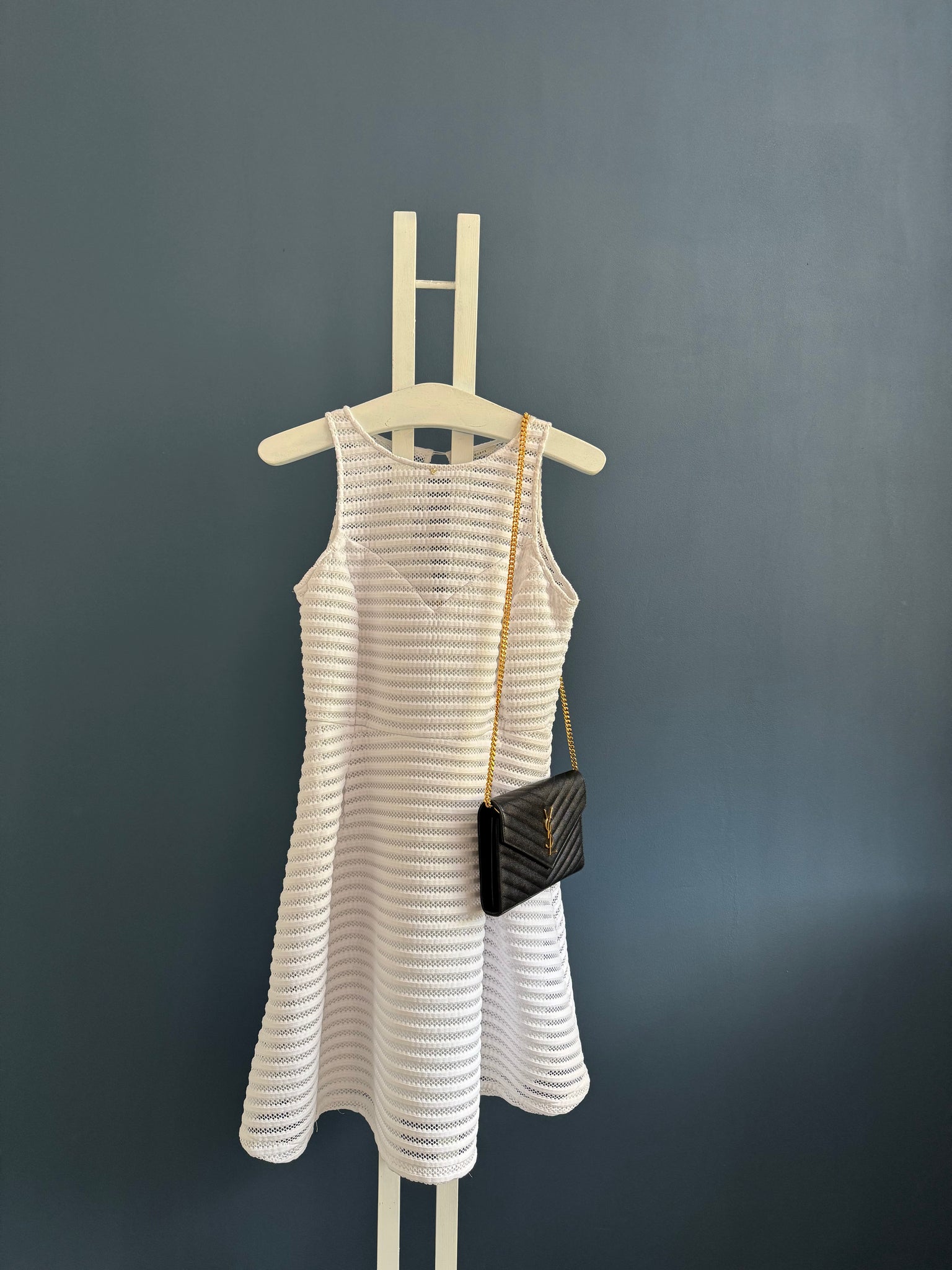 Die Tasche kann auf verschiedene Arten getragen werden, einschließlich über der Schulter, als Clutch oder Crossbody. Die Kette ist abnehmbar, was die Nutzung als Clutch ermöglicht.